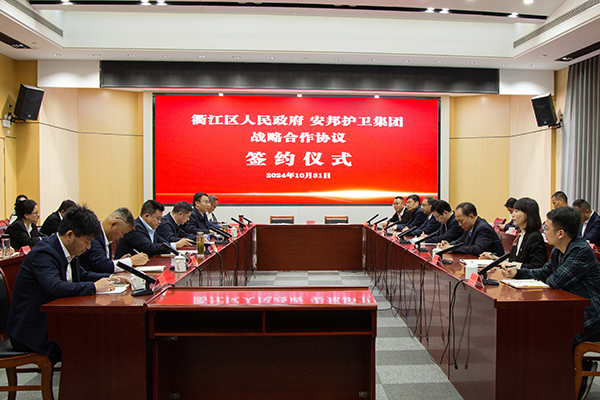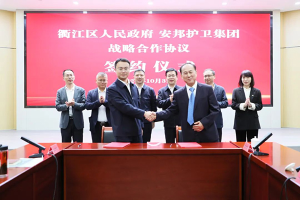 10月31日,安邦护卫集团股份有限公司与衢州市衢江区人民政府签订战略合作协议。双方将紧紧围绕省委决策部署,深入实施数字经济创新提质“一号发展工程”,立足各自所长、聚焦特色亮点,在产业数字化升级、政府治理能力提升、公共安全服务等领域开展全方位、多层次合作,努力实现互惠互利、合作共赢,携手开创区域经济社会高质量发展新局面,实现“双向赋能”。