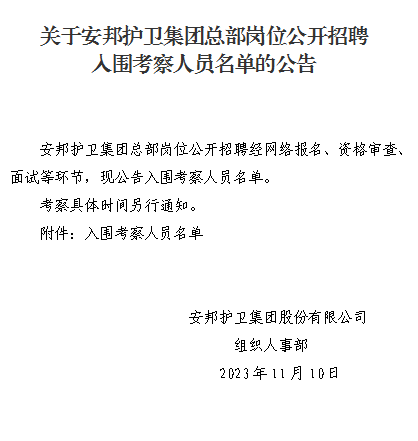 集团总部岗位公开招聘入围考察人员名单的公告