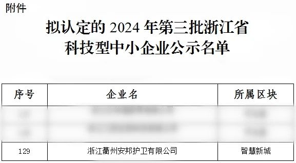 根据《衢州市科技局关于2024年第三批浙江省科技型中小企业认定公示的通知》,浙江衢州安邦护卫有限公司入选2024年第三批浙江省科技型中小企业名单。