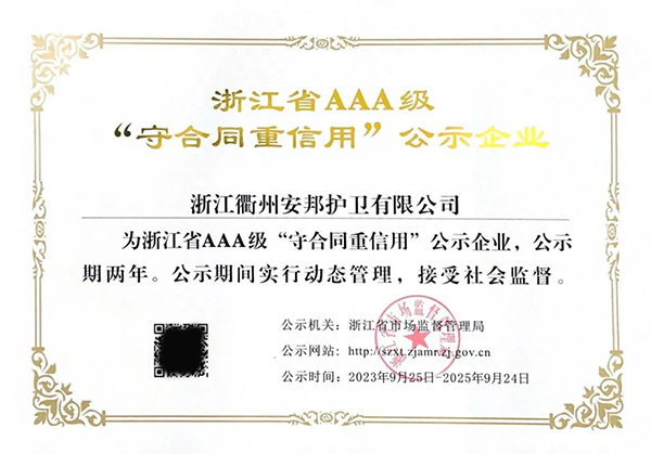 根据《浙江省“守合同重信用”企业公示办法》,经企业申报和各级审核推荐,省市场监督管理局向社会公示2023年浙江省AAA级“守合同重信用”企业1718家,其中浙江衢州安邦护卫有限公司榜上有名,公示期两年。这是继2021年荣获后,公司再一次获得该称号。