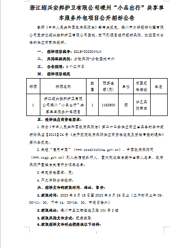 浙江绍兴安邦护卫有限公司嵊州“小品出行”共享单车服务外包项目公开招标公告