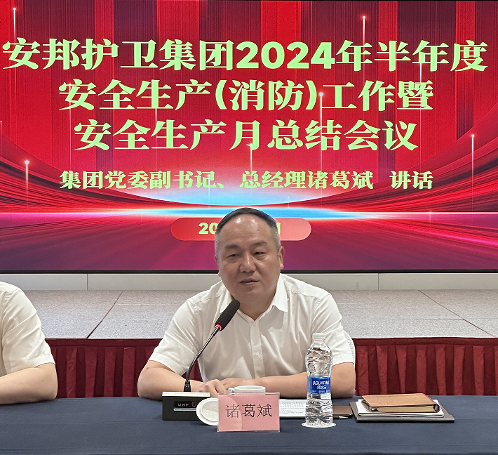 6月28日上午,安邦护卫集团2024年半年度安全生产(消防)工作暨安全生产月总结会议在杭州召开,集团党委副书记、总经理诸葛斌出席会议并讲话,党委委员、副总经理郭子仪参加。