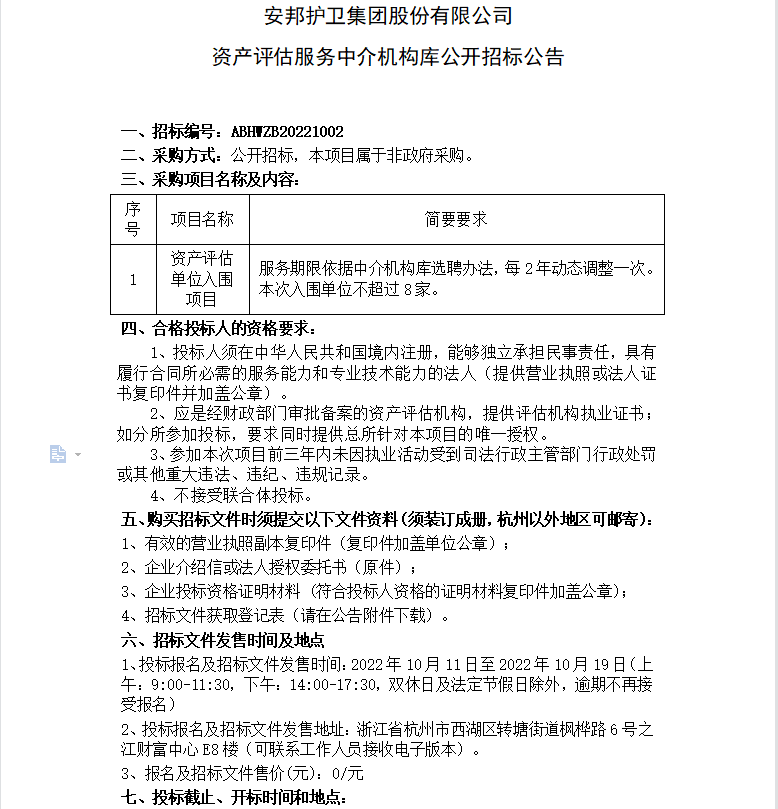 安邦护卫集团股份有限公司资产评估服务中介机构库公开招标公告