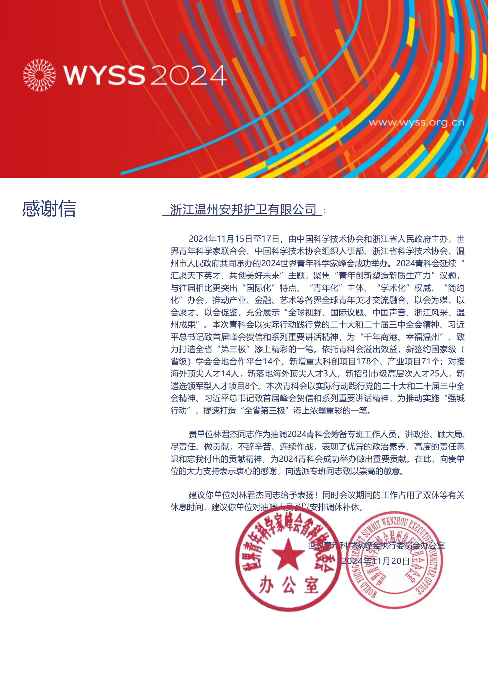 近日,温州安邦护卫公司收到世界青年科学家峰会执行委员会办公室的《感谢信》,信中特别感谢了温州安邦安全科技服务有限公司总经理林君杰同志及抽调2024青科会筹备专班工作人员,他们讲政治、顾大局、尽责任、做贡献,不辞辛苦、连续作战,表现了优异的政治素养、高度的责任意识和忘我付出的贡献精神,为2024青科会成功举办做出重要贡献。