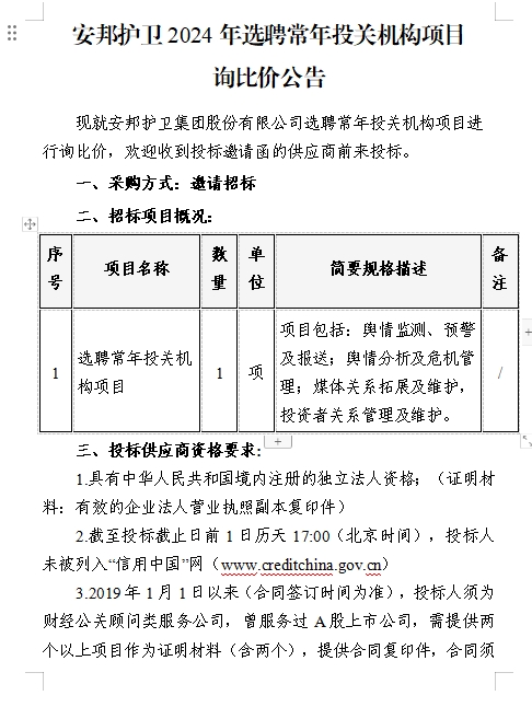 安邦护卫2024年选聘常年投关机构项目 询比价公告