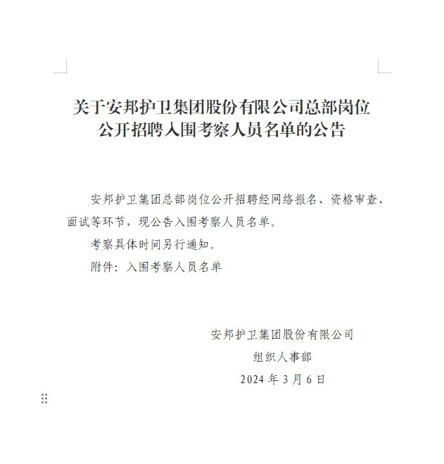 关于安邦护卫集团股份有限公司总部岗位公开招聘入围考察人员名单的公告
