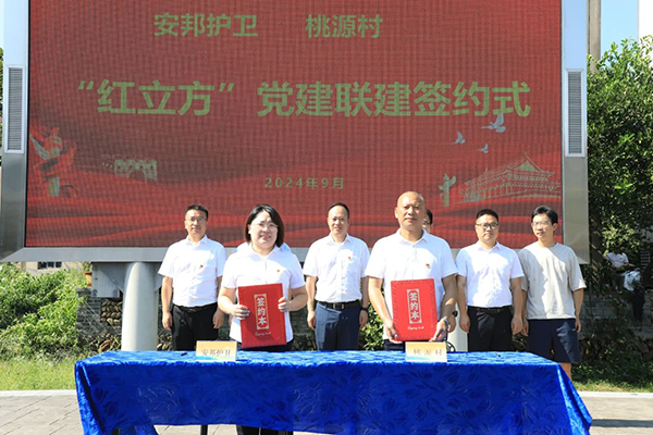 在大家的共同见证下,衢州安邦护卫机关党支部书记黄晨霞和桃源村党总支书记陈树富签订《“红立方”党建联建协议》并授牌,双方将通过组织联建、理论联学、活动联办、文化联创、项目联投、人才联育等方式,有效整合在党建、人力、智力、教育、科技、文化、信息、阵地、经费等方面的资源优势,努力形成一批可看、可听、可品、可感的乡村文化建设成果,助力农村农民共同富裕。