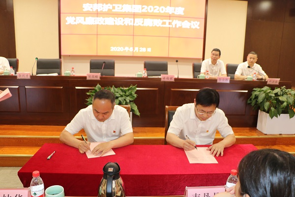 集团党委书记、董事长吴高峻出席会议并讲话,集团党委副书记余兴才主持会议,集团党委委员、纪委书记卢卫东代表集团纪委作党风廉政建设和反腐败工作报告。会上,吴高峻与集团领导班子成员签订了《领导班子成员党建暨党风廉政建设责任书》、与各子公司党组织书记签订了《清廉安邦护卫建设责任书》。