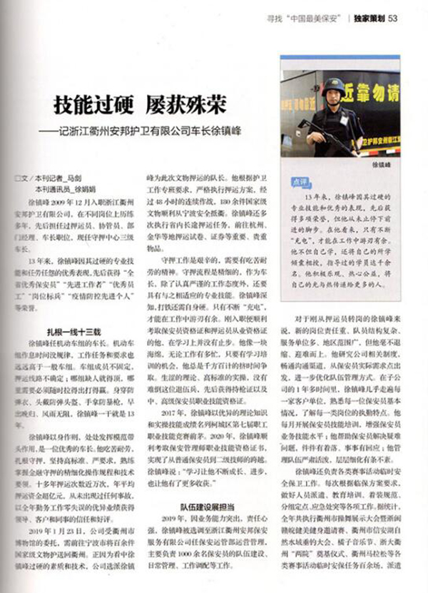 徐镇峰2009年12月入职浙江衢州安邦护卫有限公司,在不同岗位上历练多年,先后担任过押运员、协管员、部门经理、车长职位,现任守押中心三级车长。