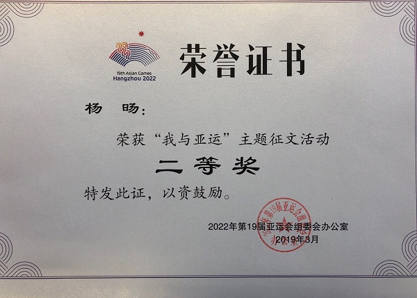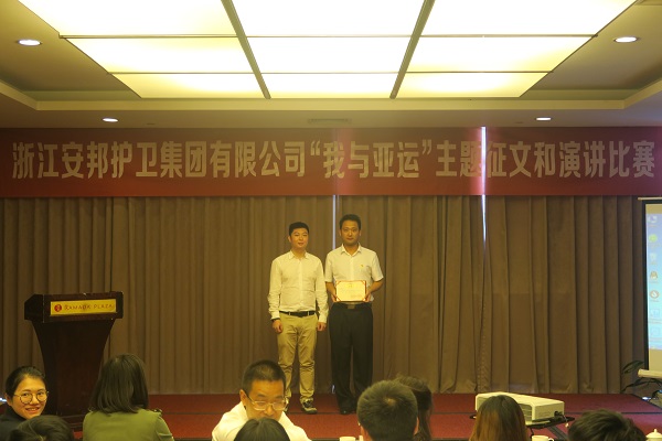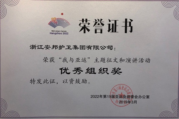 热烈庆贺安邦护卫集团在由2022年第19届亚运组委会、共青团浙江省委、浙江省教育厅举办的“我与亚运”主题征文和演讲活动中荣获优秀组织奖,安全服务公司杨旸荣获“我与亚运”主题征文活动二等奖。