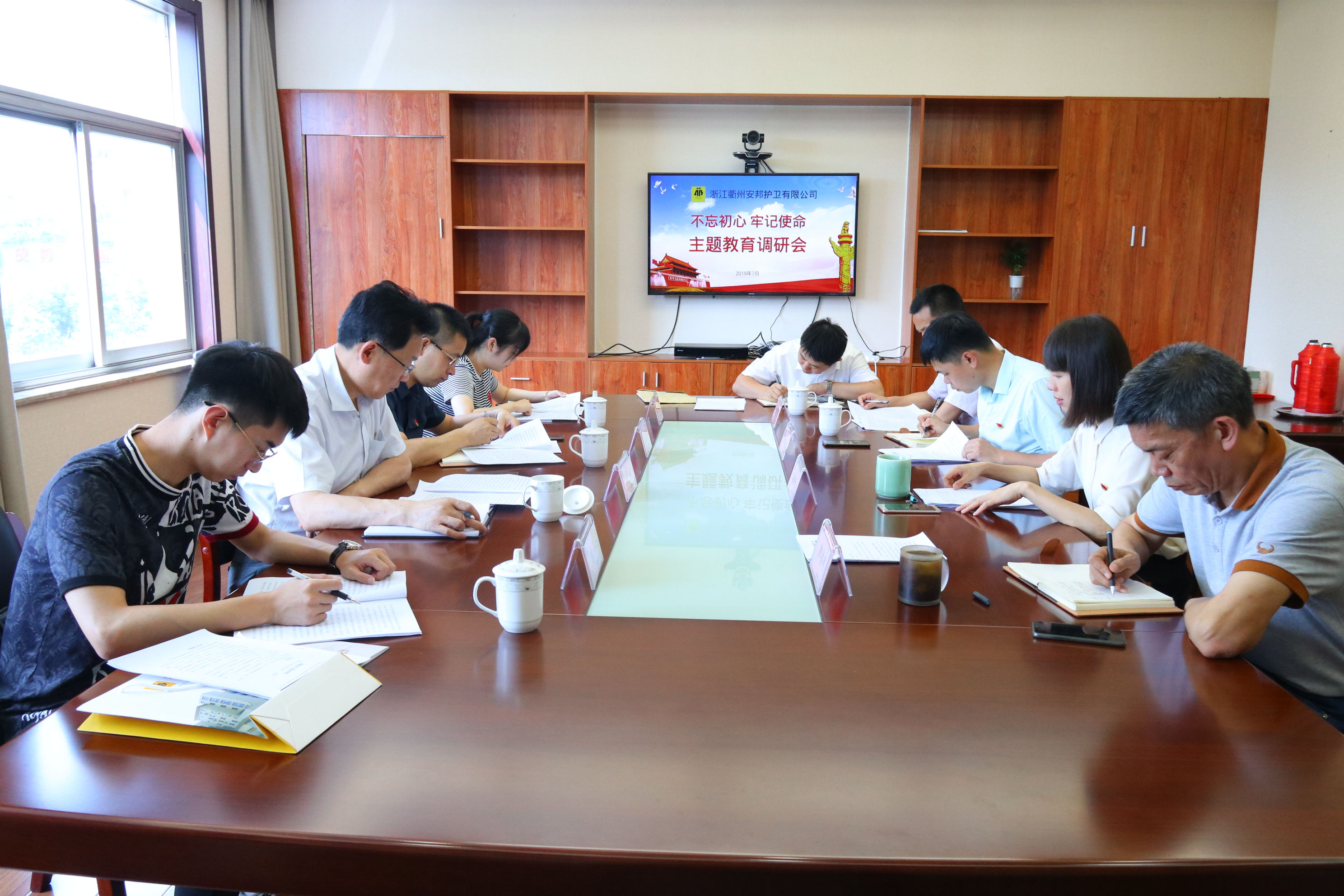 7月2日,浙江安邦护卫集团有限公司党委副书记余兴才一行来到浙江衢州安邦护卫有限公司,开展“不忘初心、牢记使命”主题教育调研,衢州公司党委书记、总经理张淑芬,党委副书记、纪委书记郭启明,党委委员、副总经理郑胜,党委委员、总经理助理琚苏炳参加调研会。