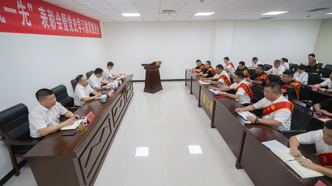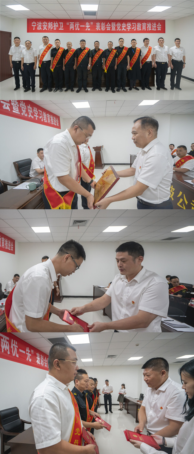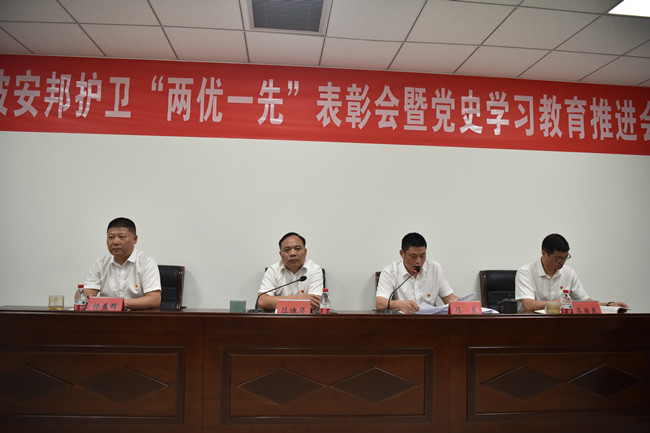 为庆祝中国共产党成立100周年,表彰先进、鼓舞士气、激发斗志,更好地推进宁波公司党史学习教育,7月14日,公司召开“两优一先”表彰会暨党史学习教育推进会。党委书记、董事长、总经理上《弘扬“红船”精神,汲取奋进力量,奋力当好推进宁波安邦护卫高质量发展排头兵》专题党课。党委副书记、纪委书记陈良主持,党委班子成员,各支部书记、部室负责人,受表彰人员共40余人参加会议。