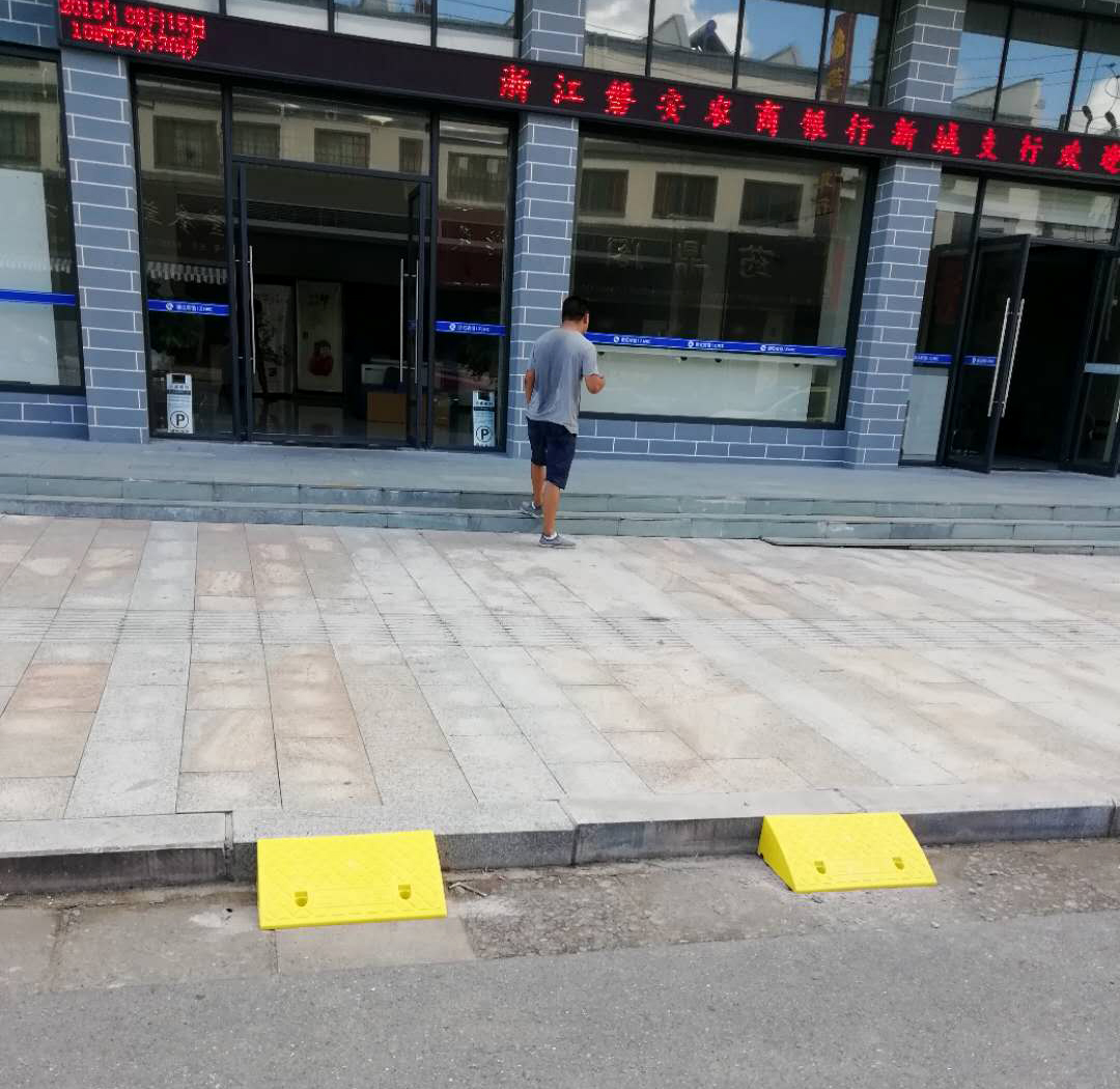 近日,由于磐安农商银行新城网点人行横道提升改造,导致运钞车辆无法顺利通行,实现零距离停靠。为此,磐安农商行中队陈建“自掏腰包”购置马路斜坡垫,方便运钞车辆通行,确保零距离交接。(磐安农商行中队 陈建)