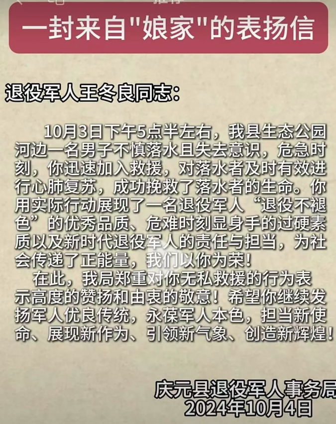 近日,收到一封来自“娘家”的表扬信——庆元县退伍军人事务局关于表扬王冬良同志见义勇为事迹的感谢信。10月3日下午5点半左右,丽水庆元县生态公园河边一阵嘈杂声,吸引了回家途中浙江温州安邦护卫有限公司一大党支部书记、大队长王冬良同志,王冬良顺着人们口中的描述飞速赶到现场,正发现一名热心市民迎着湍急的水流搂住一名落水男子奋力游向岸边。在这危急关头,王冬良与另一名身着黑衣的市民与救人者无缝衔接,配合救人者将落水者拉到礁石上立马开展心肺复苏,当时落水者脸色苍白已经没有了意识,经过两个人及时实施心肺复苏,落水男子慢慢恢复了意识,没有了生命危险。