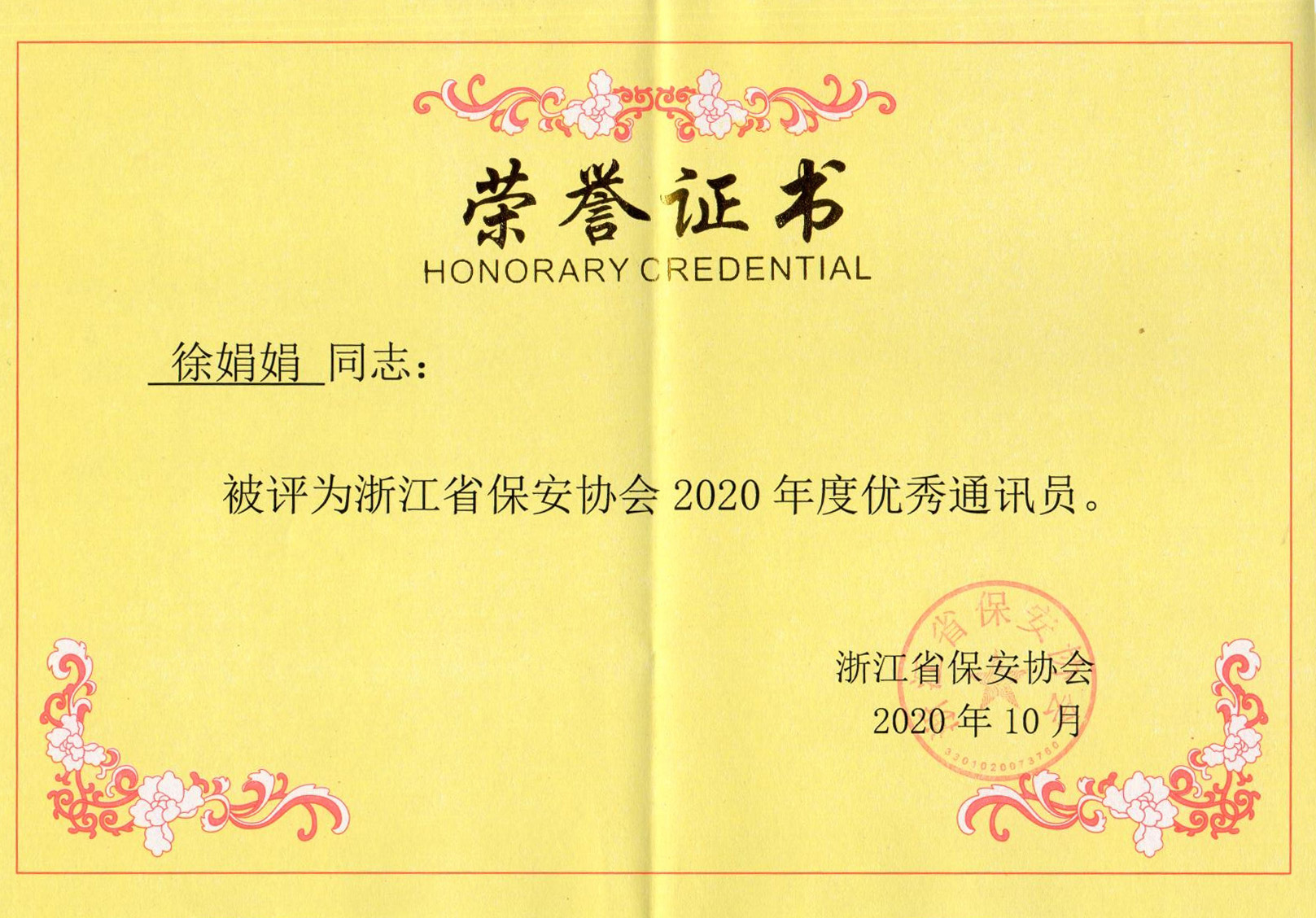 会上,浙江衢州安邦保安服务有限公司被授予“二级保安服务公司”荣誉牌匾。员工徐娟娟被授予“2020年度优秀通讯员”荣誉证书。